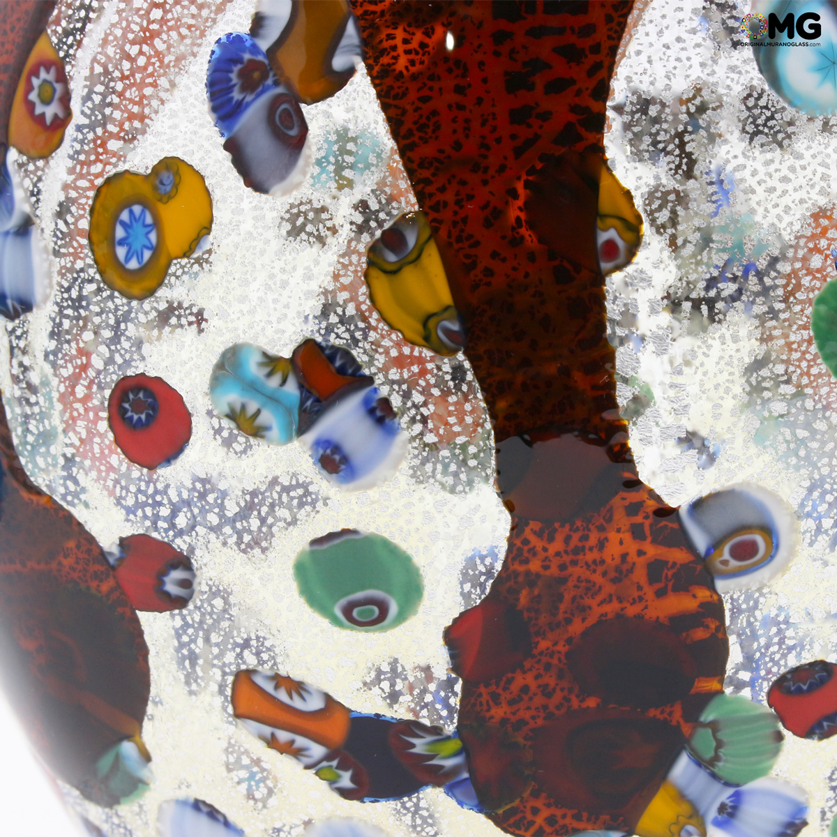 Vase made with the technique of blown glass, decorated with silver leaf and colorful variegated murrine.