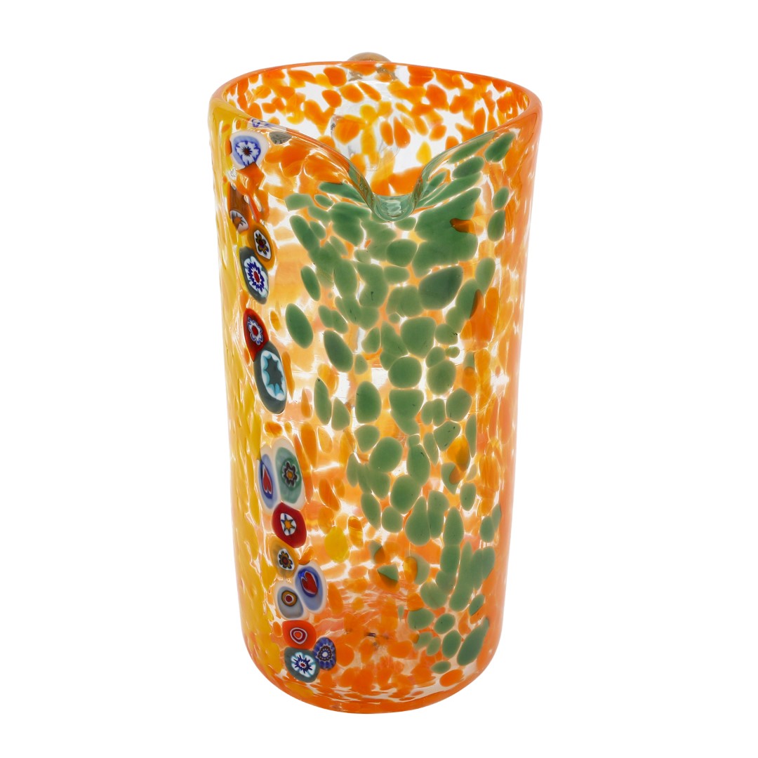 Pitcher in venetian glass handmade with the technique of glass blowing, with multicolored glass spots and millefiori decoration. This original Murano glass vase is signed by the glass master.