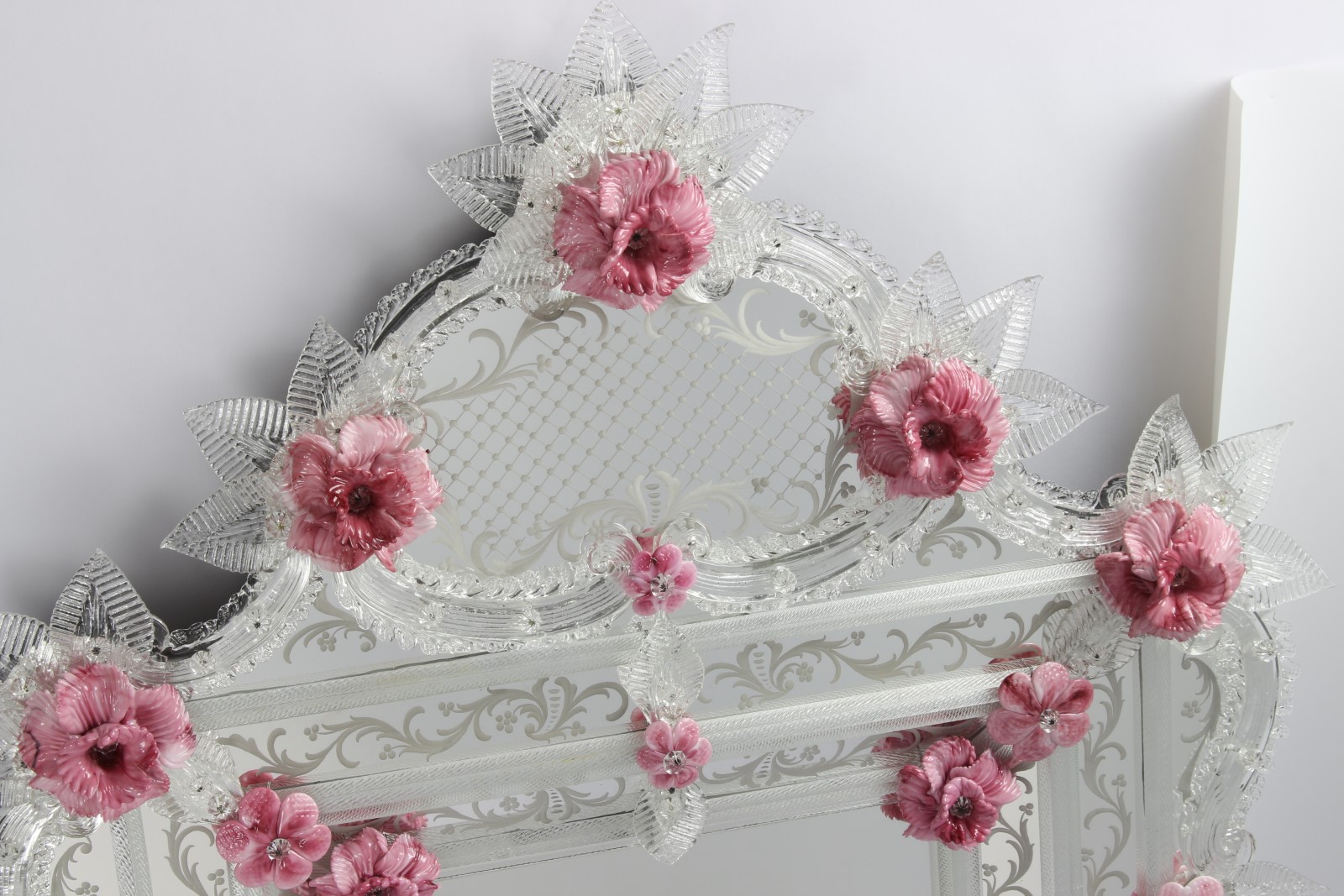 The mirror consists of a floral decoration made with Murano glass flowers and leaves.