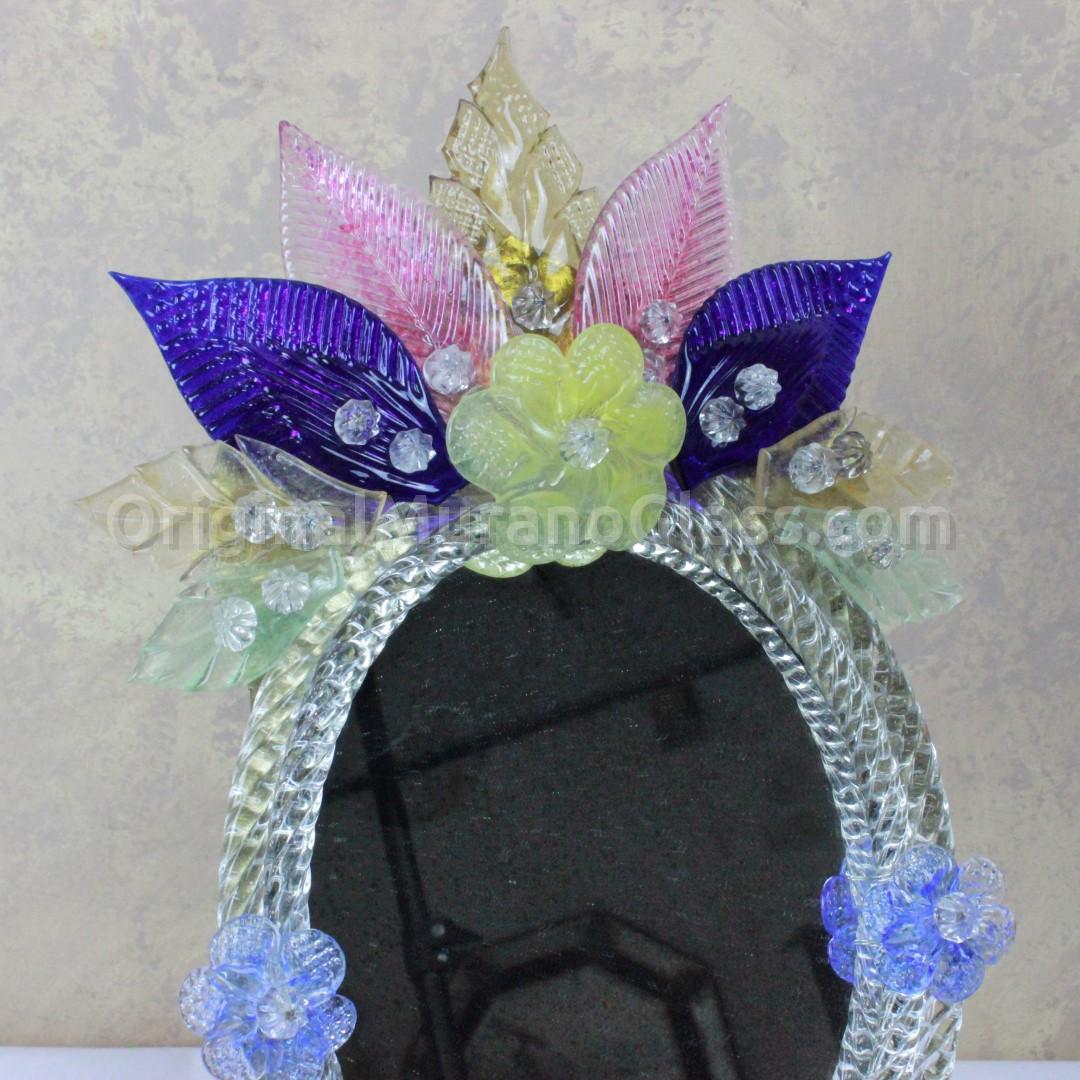 The frame mirror consists of flower and leaves decoration made in authentique Murano glass.