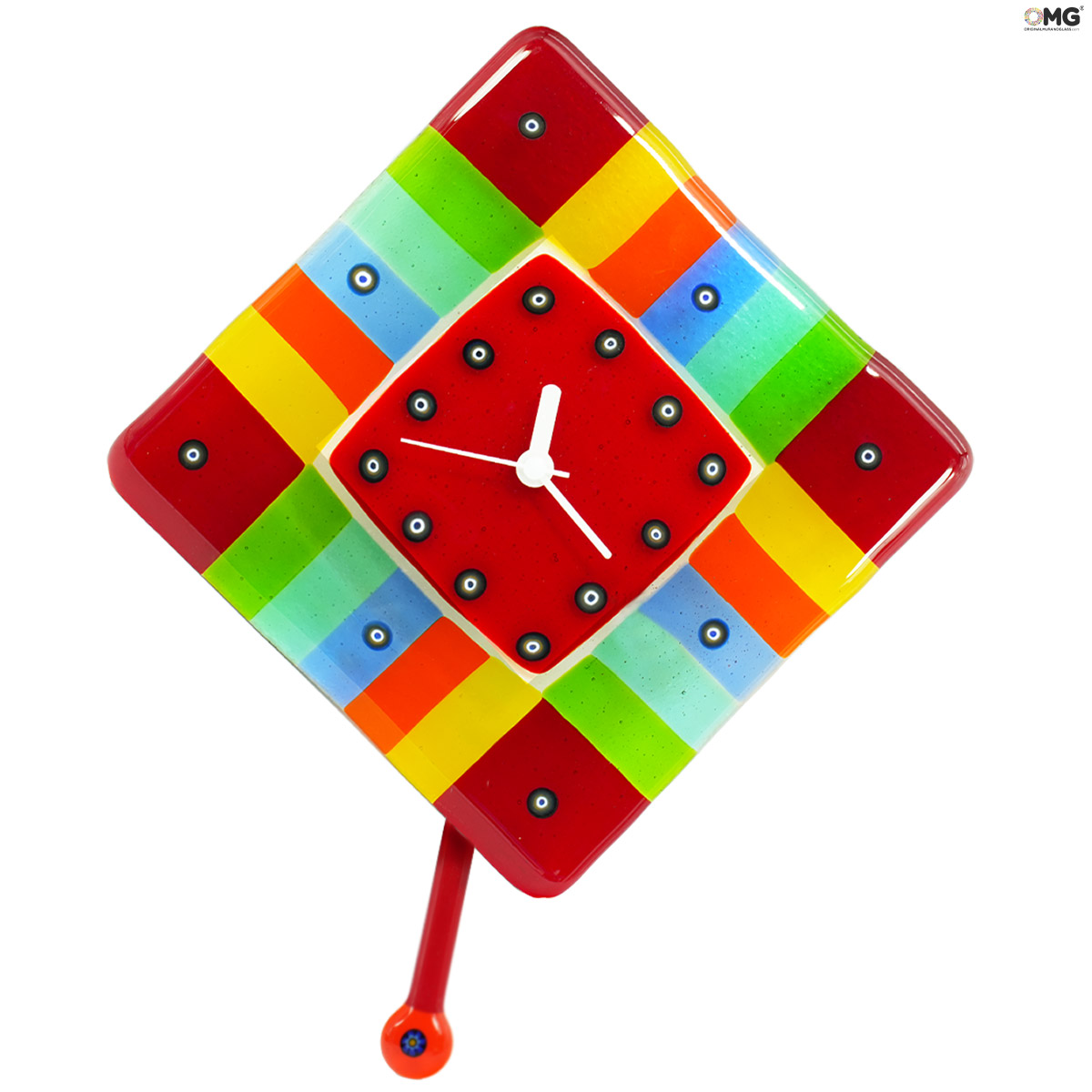 Colorful pendulum wall clock made with glass fusing technique and millefiori. Perfect art work to give a touch of cheerfulness to your house or office. Lovely also as gift idea for an useful and funny present.